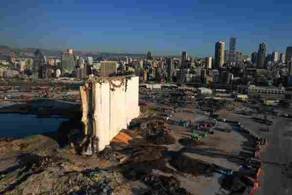 An areal view shows Beirut port on May 27, 2021, with the grain silos in the foreground, damaged in a massive explosion on August 4 of last year.