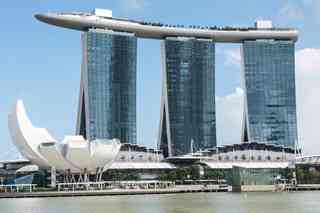 The monumental Marina Bay Sands resort was completed in 2011 on the Singapore waterfront. The centerpiece of the complex is the hotel, which is made up of three 55-story towers connected by the Sands SkyPark. The cantilevered space includes a swimming pool, gardens, a public observation deck, restaurants, and jogging paths. The complex also has a casino, convention center, theaters, and the Museum of ArtScience.