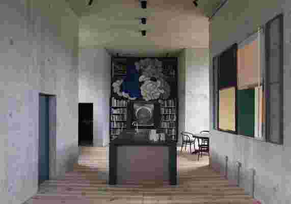 Walking in, you are hit by the scent of the logs piled along the wall of the teensy antechamber. It’s dark, too, culling your sense of sight, heightening the others. The room compresses its transients before releasing you into the great hall. This is the main space on the ground floor, an expansive room with almost-15-foot-high ceilings. Here you really see (and feel) the bare faces of the concrete, pockmarks and all. There are six towers, as such, embedded—study, laundry room, larder, washroom, and ascending stairs, stashed within. Richards looked back to before the time of the open plan, to medieval great halls and town squares, the towers emptying into the space, like Palladio’s Villa Barbaro, and pay homage to architect Tadao Ando. The house is tapered, too, the false perspective making it feel longer; the concrete slabs and wooden boards meet in the centerline, the ceiling looks bowed, vaulted, like a church.
