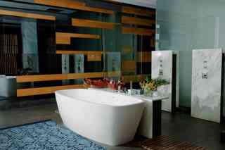 Inside Alára. The bath features a freestanding tub and Zucchetti fittings.